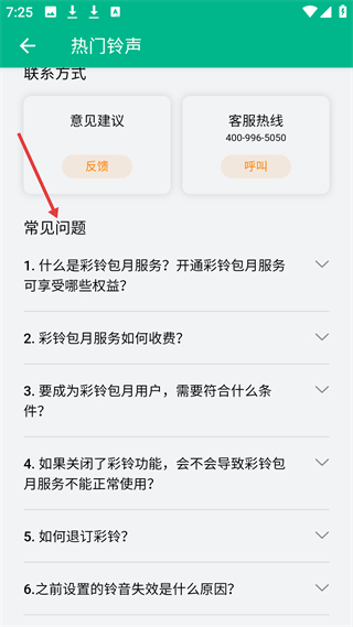 4、幫助頁,有意見反饋和客服熱線,列出彩鈴包月服務的常見問題,如權益、收費、用戶條件等。