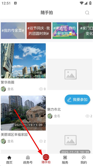 2、點擊底部隨手拍按鈕,進入隨手拍頁面,可參與各類話題活動,分享城市風光、生活瞬間,點擊我要參加可發布自己的隨手拍內容。