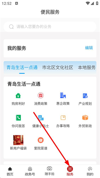 4、點擊底部服務按鈕,進入便民服務頁面,可使用青島生活一點通、市北區文化社區等服務板塊,查詢購房利好、消費政策等各類便民信息和政務服務。