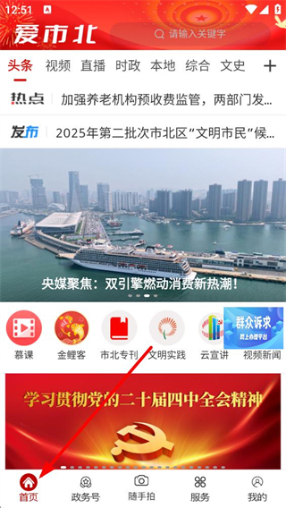 1、進入愛市北APP首頁,可瀏覽頭條、視頻等多欄目新聞資訊,參與慕課、文明實踐等特色板塊活動,了解本地熱點和發布信息。