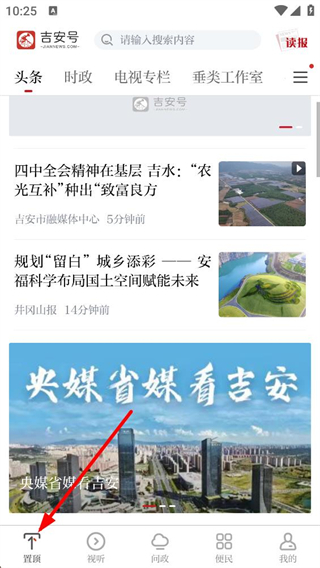 1、進入吉安號應用后,首頁可瀏覽頭條、時政等各類資訊,還有置頂、視聽等功能入口,能獲取本地新聞和多樣服務信息。