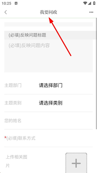 4、點擊我要問政,進入我要問政界面,需填寫反映問題標題、內容,選擇主題部門和類別,填寫姓名、聯系方式,上傳相關圖片,完成后即可提交問政。