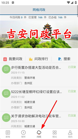 2、點擊底部問政按鈕,進入吉安問政平臺界面,可看到我要問政、問政排行等功能,能查看已受理和已辦結的問政件數,了解問政動態。