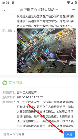 3、問政詳情界面可查看問政內容和官方回復,還能輸入評論內容進行互動,參與問政討論。