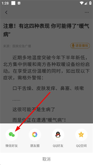 4、資訊詳情頁點擊分享按鈕,可選擇微信好友、朋友圈等渠道分享內容,完成信息傳遞后可點擊取消關閉分享界面。