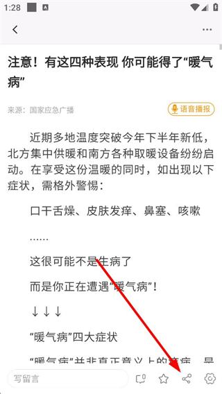 3、點擊資訊詳情頁可查看完整內容,如暖氣病相關科普,包含癥狀、成因等信息,還支持語音播報功能,方便獲取內容。
