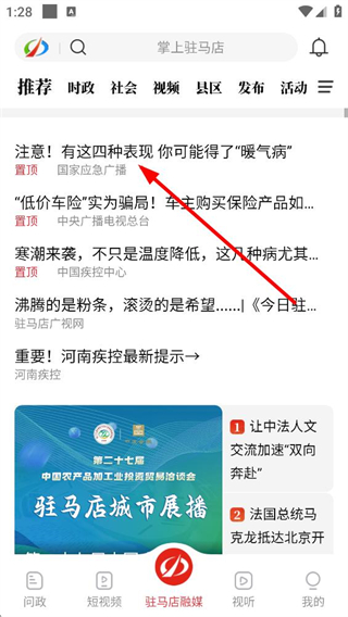 2、駐馬店融媒板塊的推薦資訊中,可瀏覽健康提示、政策提醒等內容,頂部設搜索欄,能快速查找所需資訊,獲取實用信息。