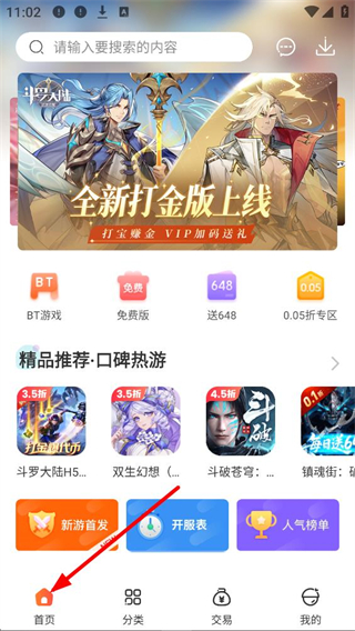 1、進入首頁界面,可搜索游戲內容,查看斗羅大陸等游戲推薦,使用BT游戲、免費版等功能入口,瀏覽精品推薦的口碑熱游,了解新游首發、開服表、人氣榜單等信息。