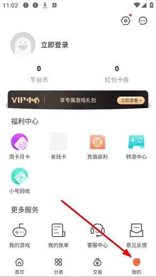2、我的界面,可進行立即登錄,查看平臺幣和紅包卡券,進入VIP中心享受專屬游戲禮包,使用福利中心的周卡月卡、省錢卡等功能。