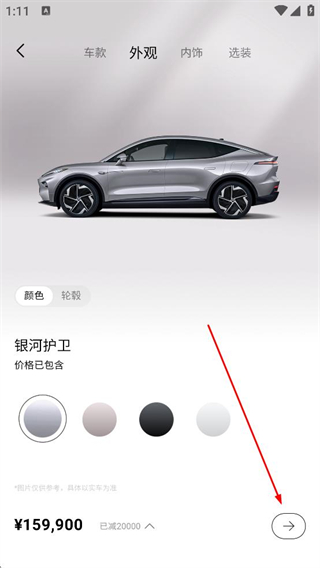 3、在外觀頁面選擇顏色可挑選銀河護衛等色系,查看對應外觀的車輛展示圖,確認后點擊對應按鈕,進入下一個配置環節繼續。