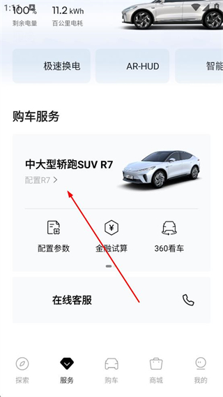 1、打開軟件進入服務頁面,查看極速換電等功能入口,選擇中大型轎跑SUVR7的配置選項,可點擊配置參數金融試算等功能,了解車輛相關信息。