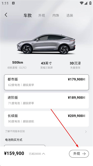 2、進入車款頁面查看都市版進階版等不同版本的價格及配置,了解續航里程等參數,點擊外觀按鈕切換至外觀選擇界面,挑選車輛外觀樣式。