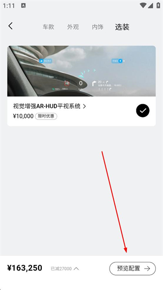 4、進入選裝頁面選擇視覺增強ARHUD平視系統等選裝配置,查看選裝后的價格變化,確認配置后點擊預覽配置按鈕,查看最終的車輛配置信息。