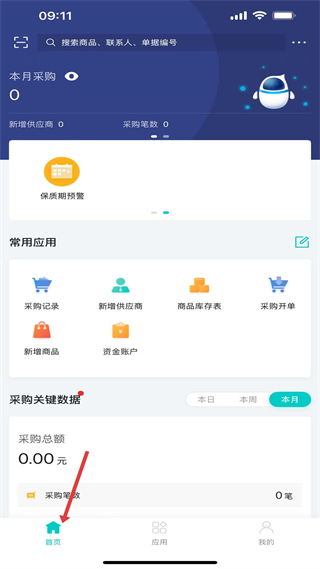 1、首頁,展示本月采購數據為零,設常用應用入口,含保質期預警模塊,底部有首頁、應用、我的三個導航欄。