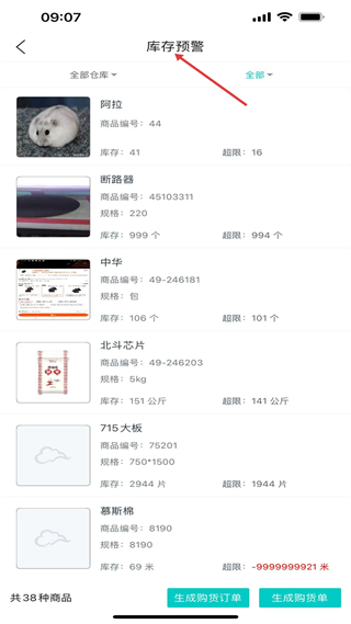 2、庫存預警頁,列出超庫存商品,顯示商品編號、庫存及超限數,共38種商品,底部可生成購貨訂單或購貨單。