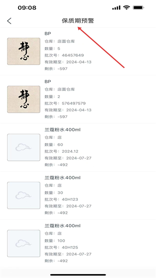 3、保質期預警頁,展示臨期商品信息,含倉庫、數量、批次號及有效期,部分商品剩余數顯示異常負數。