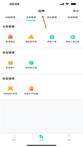 4、應用頁,分采購、倉庫等管理模塊,倉庫管理含新增商品等功能,資金、標簽管理也有對應操作入口。