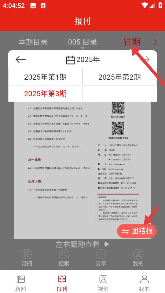 3、點擊報刊頁往期按鈕彈出2025年第1至3期選項,布局直觀,配合團結報標識,便于用戶切換查看往期報刊內容。