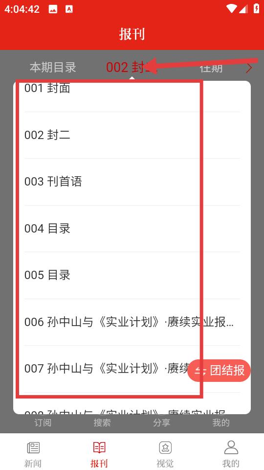 2、報刊目錄頁羅列多條目從001封面到007等依次排列,當前聚焦002封二,條目清晰,方便用戶快速定位報刊內頁內容。