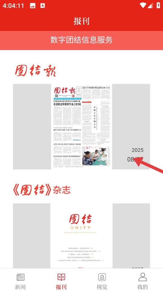 1、報刊頁面展示團結報和團結雜志板塊,團結報呈現2025年08月期內容,排版規整,助力用戶便捷瀏覽當期報刊資訊。