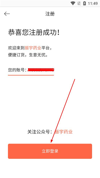 3、注冊成功后進入提示頁面,查看分配的賬號信息,關注指定公眾號,點擊立即登錄按鈕,跳轉至登錄界面準備進行賬號登錄。