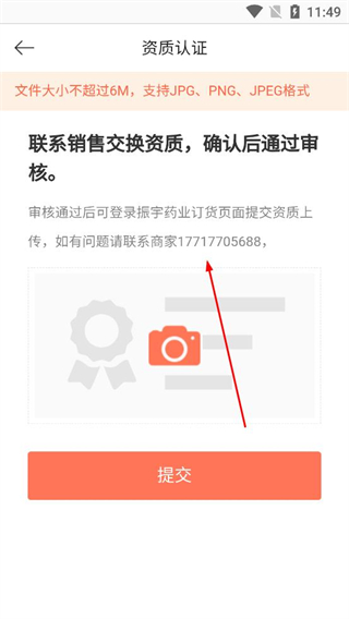 2、在資質認證資料提交頁面確認文件格式和大小要求,點擊拍攝按鈕上傳對應資質文件,檢查文件無誤后,點擊提交按鈕完成資料上傳。