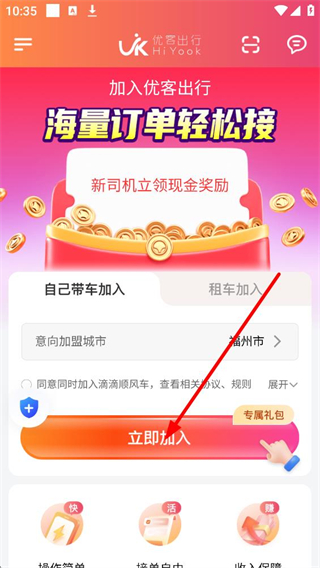 1、進入優客出行界面,可選擇自己帶車加入或租車加入,選擇意向加盟城市后點擊立即加入,新司機可立領現金獎勵,還可享受專屬禮包。