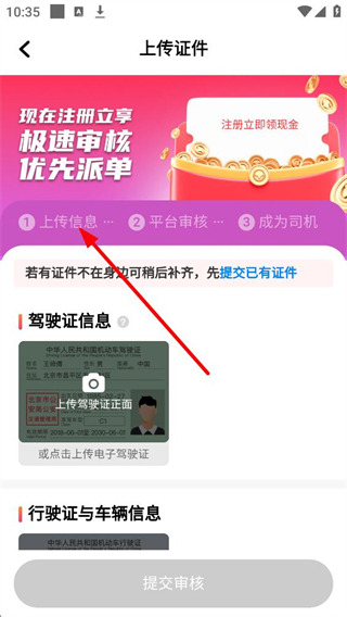 2、上傳證件界面,需上傳駕駛證信息和行駛證與車輛信息,若有證件不在身邊可稍后補齊,先提交已有證件,完成后可提交審核,注冊立享極速審核和優先派單。