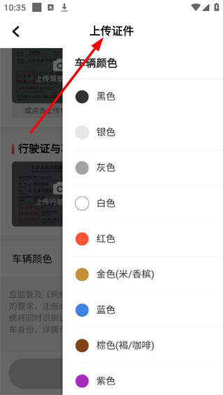 3、車輛顏色選擇界面,有黑色、銀色、灰色等多種顏色可供選擇,選擇后可完善車輛信息,完成司機注冊流程。