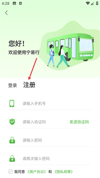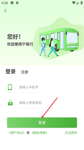 1、進入寧易行的登錄界面,選擇登錄選項,輸入手機號與登錄密碼,確認信息后點擊登錄按鈕,同時需留意用戶協議和隱私政策。