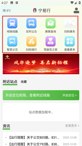 3、登錄后進入寧易行首頁,可見地鐵線路實時公交等功能入口,可開啟定位查看附近站點,同時能獲取出行資訊提醒。