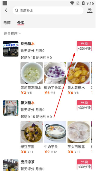 4、在搜索結果頁面切換至外賣分類,瀏覽對應的商品如茉莉花凍凍水等,查看價格及配送信息,選擇心儀商品準備下單購買。