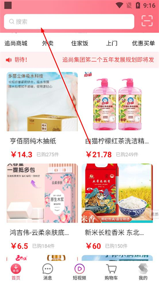 2、登錄后進入首頁瀏覽追尚商城的各類商品,可查看推薦的抽紙洗潔精等物品,也能使用搜索功能查找特定商品,了解商品信息。