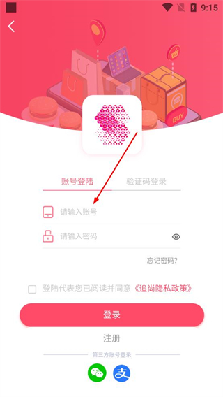 1、打開追尚app,進入賬號密碼登錄頁面,輸入賬號和密碼,勾選登錄代表已閱讀并同意追尚隱私政策,點擊登錄按鈕完成賬號登錄。