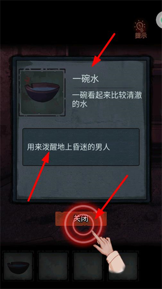 2、收集水后會顯示一碗水的詳情,說明可用來潑醒地上昏迷的男人,查看后點擊關閉按鈕回到主場景。