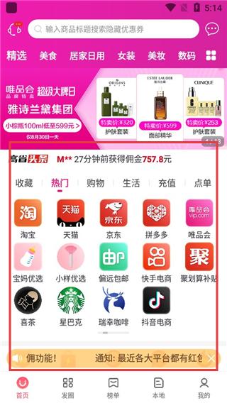 2、進入軟件首頁后,我們可以看到時下最熱門的電商平臺,只要用戶任意點擊一個平臺并按照要求即可購買商品或賺取傭金。