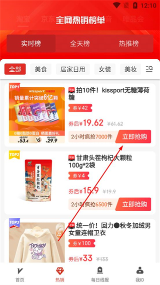 3、登錄后進入熱銷板塊查看全網熱銷榜單,選擇實時榜、全天榜等分類,瀏覽各類商品點擊搶購按鈕。