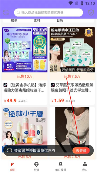 1、打開促說軟件進入首頁,可瀏覽榜單、素材等板塊商品,點擊去登錄,可領取海量優惠券,享受購物優惠。