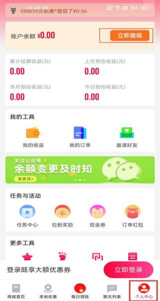 3、進入個人中心界面,點擊上方的立即提現,根據提示綁定銀行卡之后就能提現了。