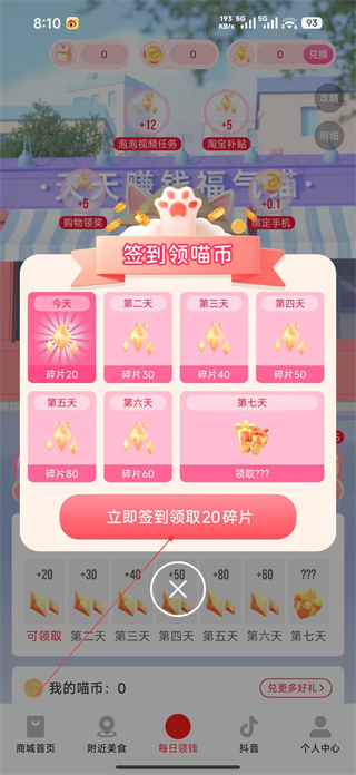 1、打開軟件進入每日賺錢頁面,點擊簽到領喵幣彈窗里的立即簽到按鈕,領取今日20碎片,關閉彈窗后查看新手賺喵幣任務。