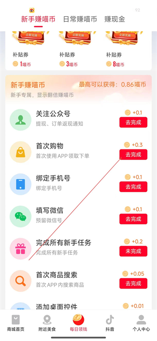 2、在新手賺喵幣頁面可選擇關注公眾號等任務獲取喵幣,完成后切換到嗨購首頁,瀏覽商城里的各類商品。