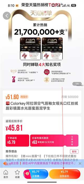 4、在商品詳情頁了解該唇釉的熱銷數據及返現優惠,可選擇分享賺或自助返現等方式,參與該商品的優惠活動。