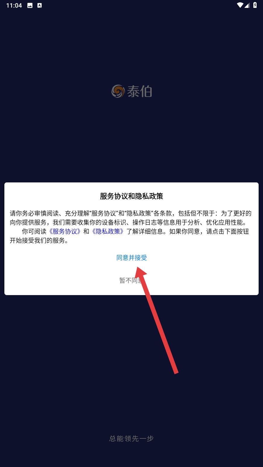 1、打開泰伯應用,彈出服務協議和隱私政策彈窗,仔細閱讀服務協議和隱私政策內容,點擊同意并接受,進入應用主界面。
