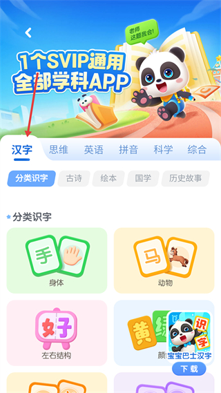 1、進入漢字模塊的分類識字界面,可選擇身體、動物等分類,借助對應標識,開展漢字認知與學習的相關操作。