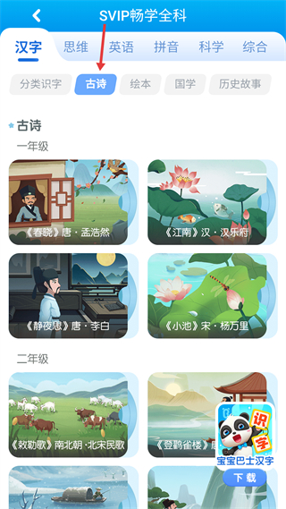 2、切換到古詩板塊,能查看分年級的古詩內容,選擇《春曉》等不同朝代的詩作,進行經典詩詞的學習與積累。