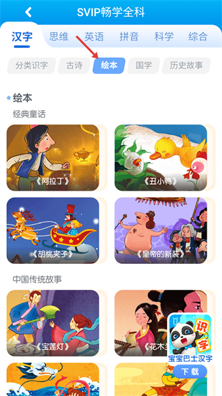 3、切換到繪本板塊,可選擇經典童話或中國傳統故事類繪本,點擊對應作品,閱讀《阿拉丁》等繪本內容。