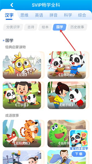 4、切換到國學板塊,能選擇經典啟蒙讀物或成語故事,通過《論語》等內容,開展國學知識的啟蒙學習。