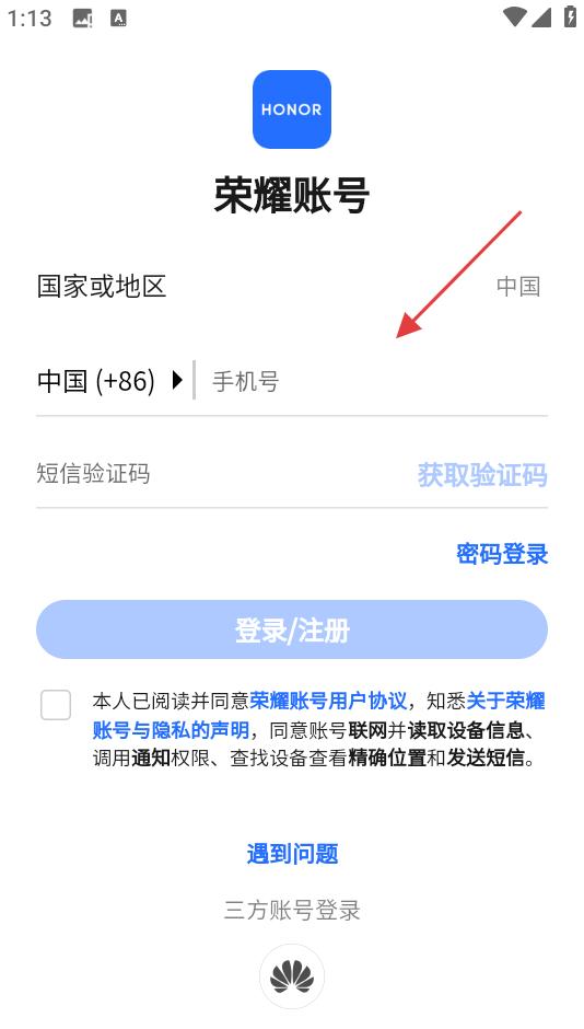 2、榮耀賬號登錄頁,選國家地區默認中國,填手機號、驗證碼點獲取驗證碼,勾選協議后登錄、注冊,支持三方賬號登錄。