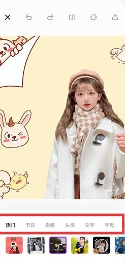 3、有大量熱門、節日、賣萌等類別的素材。如第一張圖展示的,用戶可以方便地為照片添加可愛的卡通元素。