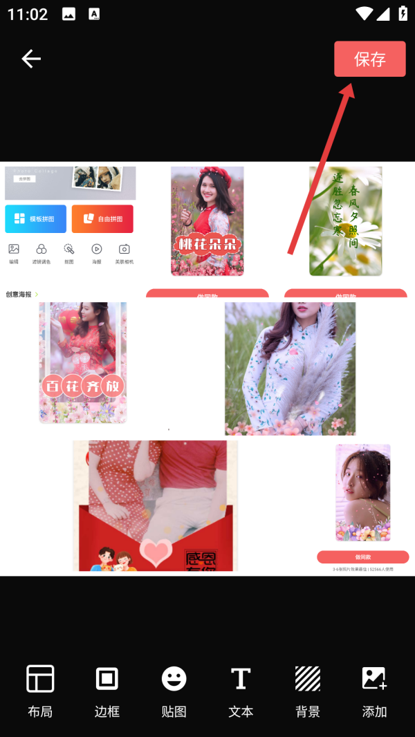 2、拼接好照片添加布局、邊框等效果后,點右上角保存系統會把拼圖暫存,保存成功后頁面跳轉,可繼續編輯或進行下一步操作,這一步將創作成果初步留存。